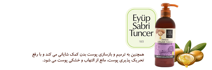 لوسیون دست و بدن ایوب صبری با عصاره روغن آرگان کاملا طبیعی، پوست بدن را به طور ویژه تغذیه می کند و نیازهای آن را کاملا برطرف می کند. روغن آرگان موجود در ترکیبات این محصول با مرطوب کردن پوست، چین و چروک پوست را کاهش می دهد و از خشکی آن جلوگیری می کند و ظاهری زنده و شاداب به پوست می بخشد.
