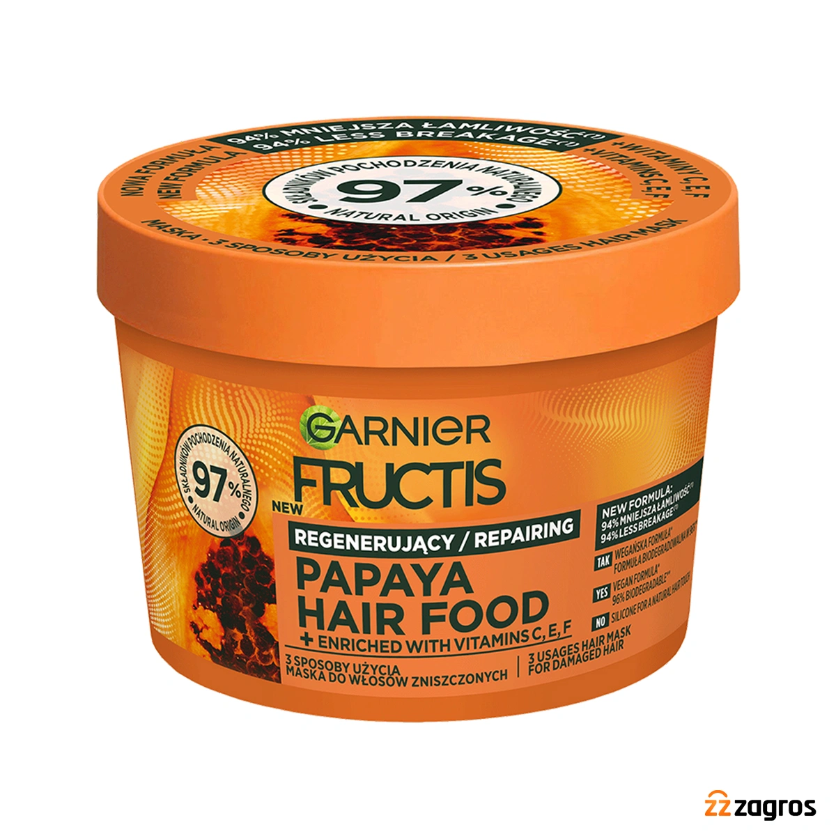 ماسک موی ترمیمکننده گارنیه مدل Fructis Hair Food عصاره پاپایا یکی از پرفروشترین محصولات مراقبت موی برند فرانسوی گارنیه است که مخصوص موهای خشک، آسیبدیده و شکننده طراحی شده است. این ماسک با فرمول وگان و حاوی حدود ۹۷٪ ترکیبات با منشأ طبیعی ساخته شده و فاقد سیلیکون، پارابن و رنگ مصنوعی است؛ بنابراین ضمن ترمیم مو، آن را سنگین و چرب نمیکند.
